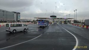 次に壊れた関空の橋をどうわたるのか興味があった。面白いことに途中から反対車線に移動するのだ。そして、関空についてからくるっと回って料金所を通りなおす!!これが面白かった。