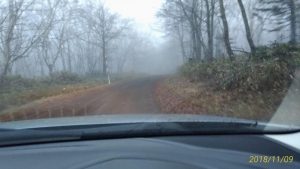 驚きのダート走行となった。。。霧も出るし。少し暗いし。途中で誰ともすれ違わないし。一つだけすれ違った???のは大きな角の鹿だけだった!!! これにもびっくりというか、怖かった。