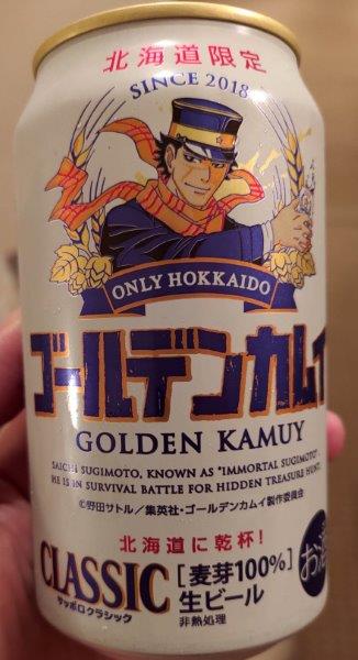 その後、市役所前に「ここに幸あり」の石碑を見つけて誰もあるいていない歩道を歌いながらあるいた。ホテルに戻る前にコンビニでビール買った。そこで見つけたのが!ゴールデンカムイビールね。素晴らしい!!