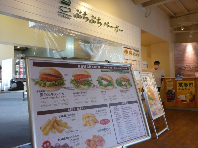 この後は、富良野に向かいました。「唯我独尊」というカレー屋に行こうと思いましたが駐車場がいっぱいで入れませんでした。仕方ないので、近所の道の駅的なマーケットに行って「ぷちぷちバーガー」というお店でハンバーガーを買いました。