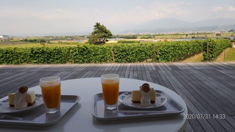 六花亭のお店だったみたいですが。何かお土産物を買う前にケーキとジュースを食べることにしました。ブドウ畑を見ながら休憩です。