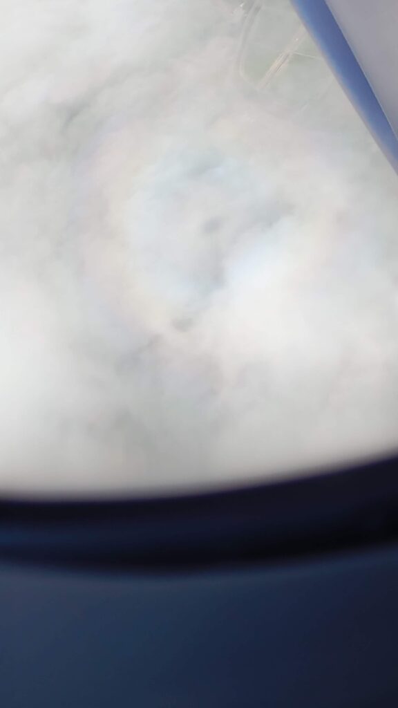 Peachに乗って千歳にもう少しのところで、日が照って、雲を見ると、やっぱりブロッケン現象が見える。これはいつも気にしていると見せる現象で、気にしていない人にはもちろん見えない。w