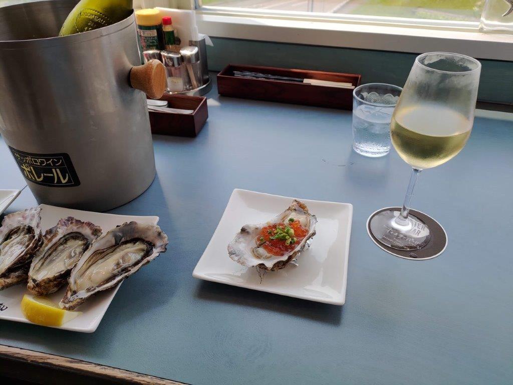 ゆっくりと、歩いて、ホテルの食事の次に楽しみにしていた道の駅に徒歩で到着!車で行くのが道の駅だけど、そうすると飲めないのでホテルからわざわざ20分かけて歩いて、道の駅に到着!平日(しかも道の駅が通常お休みの月曜日)なので人が少ない。ちゃ~~んす!1年前に行ったバールで牡蠣とシャブリに挑戦だ。いや~楽しいねぇ。これをやっている人は誰もいないけど、牡蠣とシャブリをやりにわざわざ厚岸に来るのは。。ふつうはアホなので。。仕方がない。シャブリのレモン果実のようなさっぱり感と、カキえもんやまるえもんのマリアージュは素晴らしい!