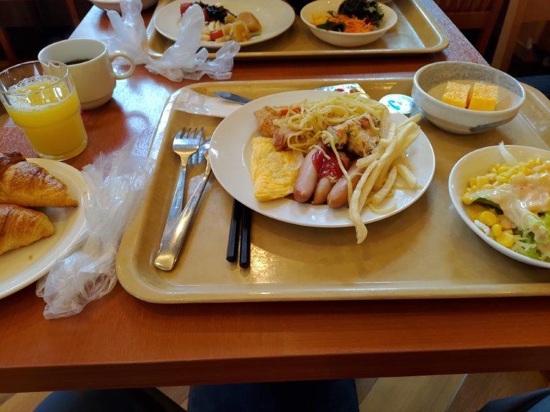 ルートイン北見大通西の朝ごはんだ。普通ですが。私の盛り付けがい・・・ちょっとだめですね。
