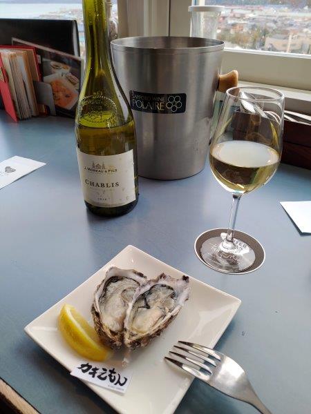 オイスターバーピトレスク。pittoresqueというフランス語 絵の主題としてふさわしいというような意味らしい。ほんと、ここから見る厚岸は綺麗だ。そして、シャブリと牡蠣!最高だ!