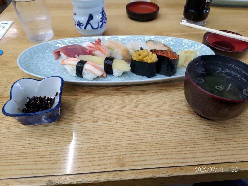 11時16分にフェリーターミナルに戻ったので、少し早めのお昼ご飯にする。フェリーターミナルのお寿司屋さんで特上?だったかなの寿司セットを頼んだ。雲丹が乗っ取ります!