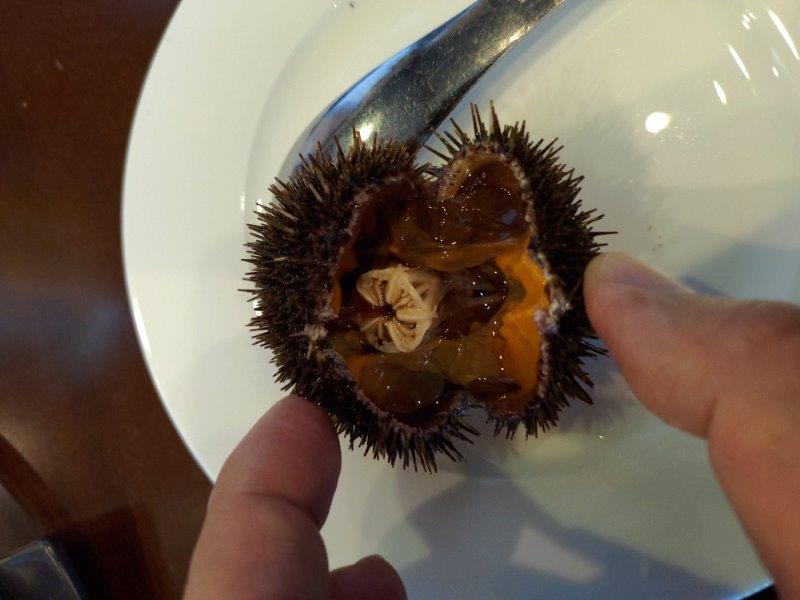 さて、さて、この旅のメインかもしれない。利尻のバフンウニにご対面だ。ムラサキウニはどこでも見るけど、バフンウニはなかなか見ることができない。高級品だ。しかも、ウニを目の前に割ってくれて、それを食べる!!!なんと素晴らしいのだろう。