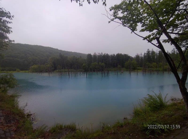 富良野は雨で、行くところもないので、美瑛に戻って、青い池に挑戦した。ここは駐車場代がかかるが、まぁ、その程度は良いんじゃないだろうか。
