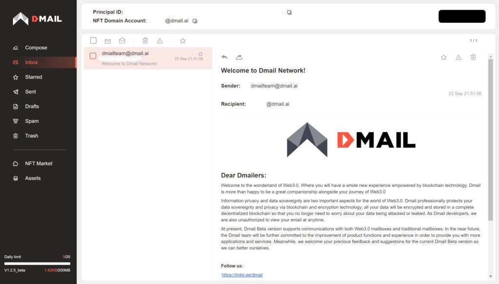 そこで、なんかエラーっぽいメッセージが出るので、別途に作成しておいた。Plugというウォレット(これがどうしてもいる)のprincipal ID(デポジットというアイコンから見つけられる)をDmailのなんか入れろ的な画面から入れるとDMAILにドメインがバインド(引っ付く?)されて動き始める。