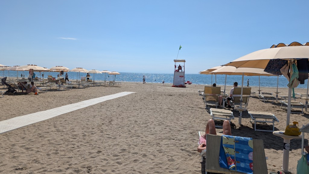 イタリアはボンボンベッドとパラソルが借りられるから最高です。日本は自分で用意してセットして、大変です。