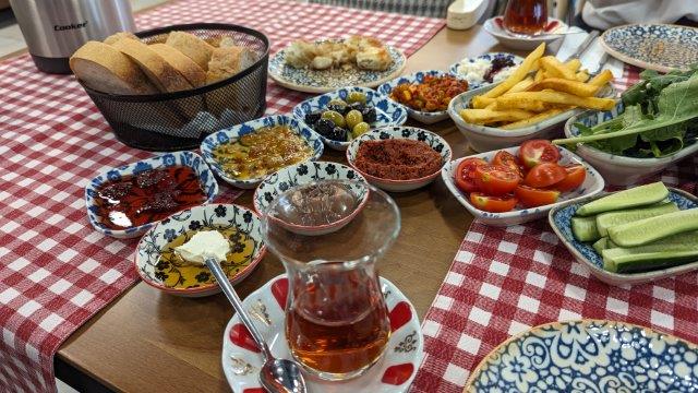 仕方ないので、たまたまのカフェでランチだ。昼に朝ごはんいうのも変だけど、トルコではお昼にブレックファーストでも良いみたいだ。すごい沢山の量が出るトルコならではの朝ごはん、なかなか楽しい。