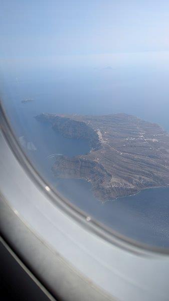 アテネからサントリーニは特に近い感じです。あっという間に到着でした。到着直前にサントリーニ島のティラの反対側の外輪山の上の通過した時の写真が下の写真です。